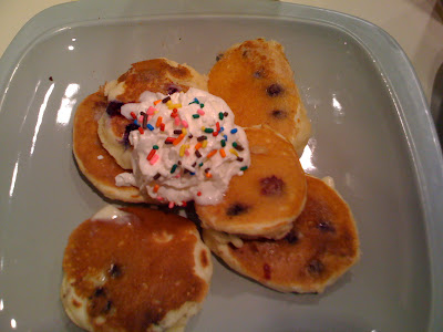 I whipped up some Betty Crocker Chocolate Chip Muffins for breakfast. Just add water! I found some strawberries in the refrigerator so we did that too.